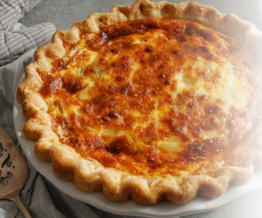 A clA classical French pie with soft buttery dough, baked with cream of Mascarpone. Assical French pie with soft buttery dough, baked with cream of Mascarpone. Originated from Lorraine, France, primary featuring Bacon; offered at Soul with Chicken, Bacon and Vegetables